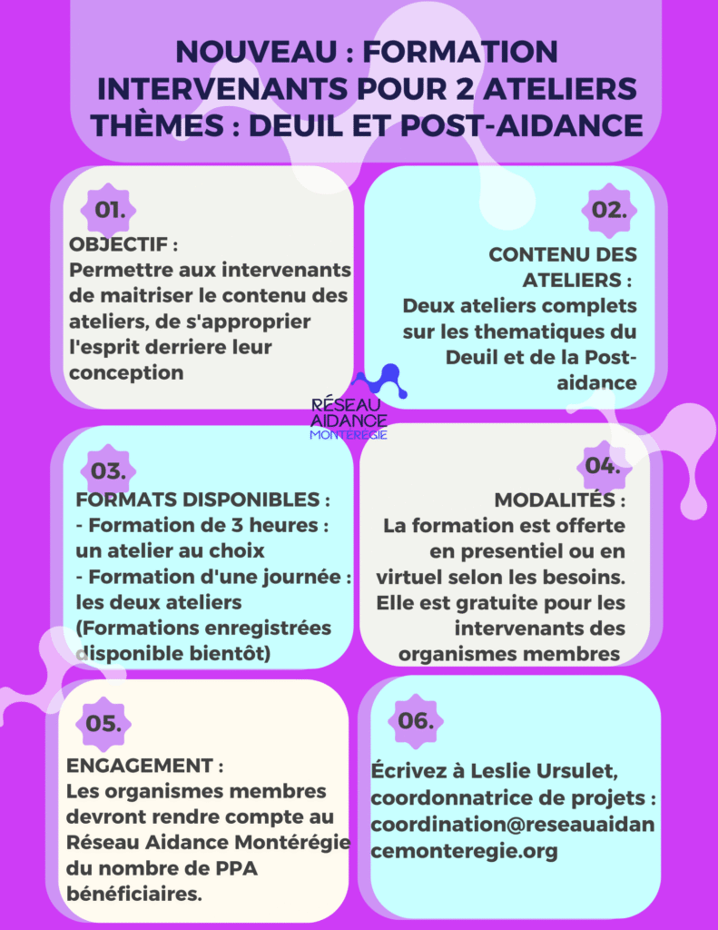 - Formation de 3 heures : centrée sur un seul atelier (au choix : Deuil ou Post-aidance).